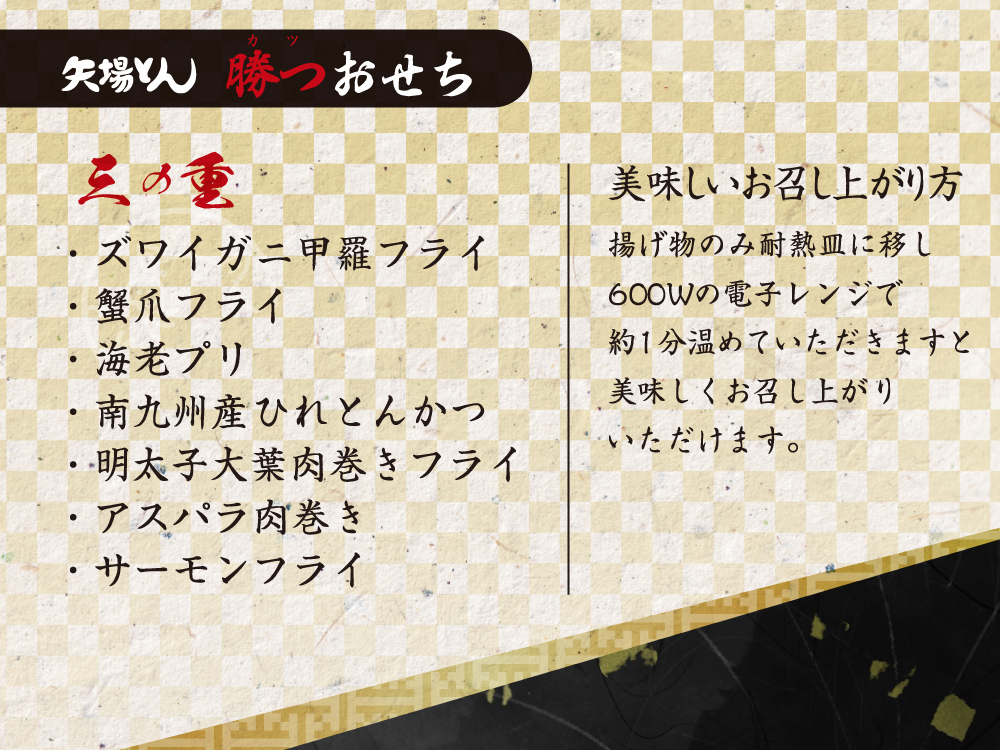 【一の重】 牛蒡と豚肉の甘辛煮(国産)、黒豆、田作り、栗きんとん、松前漬け、紅白蒲鉾、紅白酢れんこん、昆布巻き、椎茸と豚ミンチの甘露煮、伊達巻、いくらみそ漬け、さつまいもの蜜、青梅 【二の重】 みそ煮豚(国産)、みそ煮豚スライス、 あわびのみそ漬け、車海老のみそ漬け、サーモンのみそ漬け、ぶりのみそ漬け、数の子のみそ漬け、豚ローストポークのみそ漬け、梅人参 【三の重】 ひれとんかつ(国産)、 ズワイガニ甲羅フライ、 明太子大葉肉巻きフライ、アスパラ肉巻きフライ、エビフライ、サーモンフライ、蟹爪フライ |