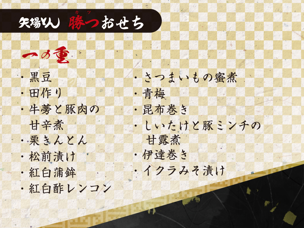 【一の重】 牛蒡と豚肉の甘辛煮(国産)、黒豆、田作り、栗きんとん、松前漬け、紅白蒲鉾、紅白酢れんこん、昆布巻き、椎茸と豚ミンチの甘露煮、伊達巻、いくらみそ漬け、さつまいもの蜜、青梅 【二の重】 みそ煮豚(国産)、みそ煮豚スライス、 あわびのみそ漬け、車海老のみそ漬け、サーモンのみそ漬け、ぶりのみそ漬け、数の子のみそ漬け、豚ローストポークのみそ漬け、梅人参 【三の重】 ひれとんかつ(国産)、 ズワイガニ甲羅フライ、 明太子大葉肉巻きフライ、アスパラ肉巻きフライ、エビフライ、サーモンフライ、蟹爪フライ |